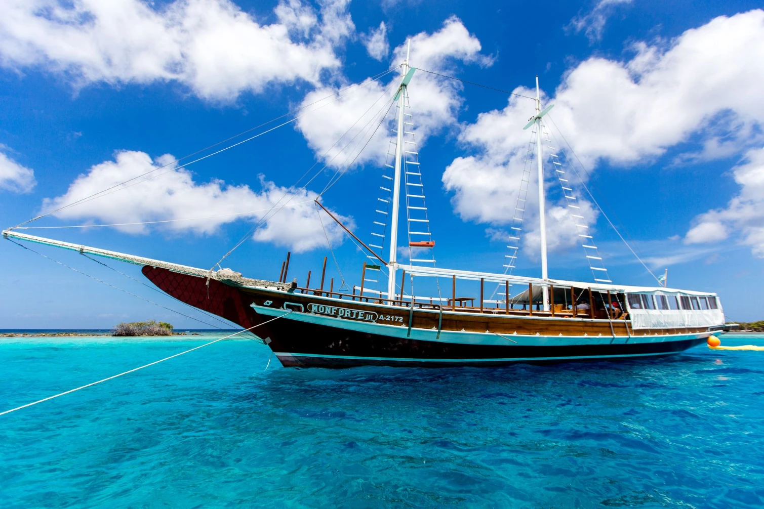 Her story began along the Atlantic shores of Brazil, where she sailed for many years before making her way to Aruba. Today, she rests in the calm waters of the Palm Beach, offering a more intimate and elegant way to experience the island.